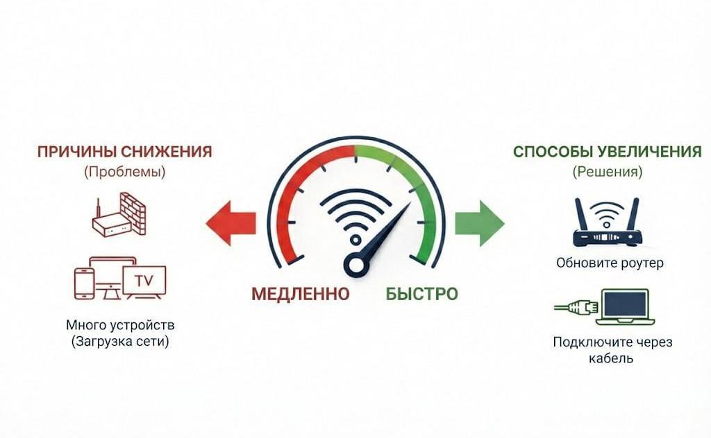 Это могут быть технические особенности оборудования, загруженность сети, настройки роутера или даже расположение вашей квартиры. В следующих блоках разберем основные причины снижения скорости и расскажем, как с этим справиться.